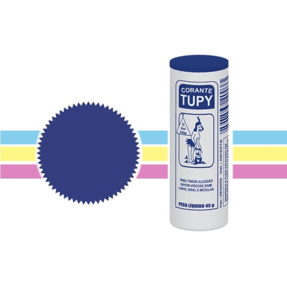 O Corante Tupy® é um corante de composição orgânica, tendo o seu pH, em média, neutro, quando dissolvido em água quente, não apresenta odor e sua forma física é sólida e não apresenta característica tóxica.